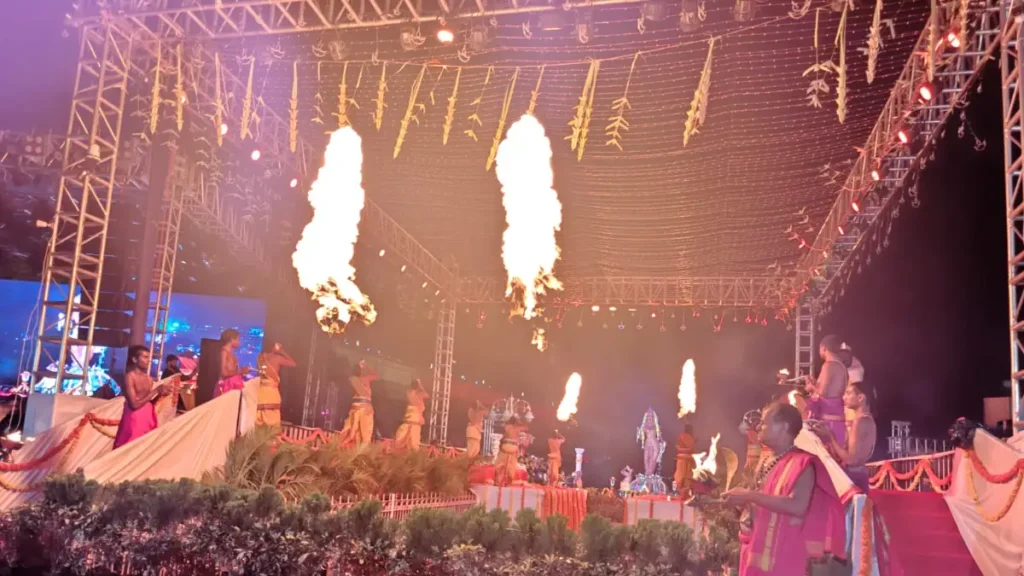 10 ಸಾವಿರಕ್ಕೂ ಹೆಚ್ಚು ನೆರೆದಿದ್ದ ಭಕ್ತರ ಸಮ್ಮುಖದಲ್ಲಿ ಮೊದಲಿಗೆ ದಕ್ಷಿಣ ಭಾರತ ಶೈಲಿಯಲ್ಲಿ ಸ್ಥಳೀಯ ಪುರೋಹಿತರ ತಂಡ ಆರತಿ ಬೆಳಗಿತು.