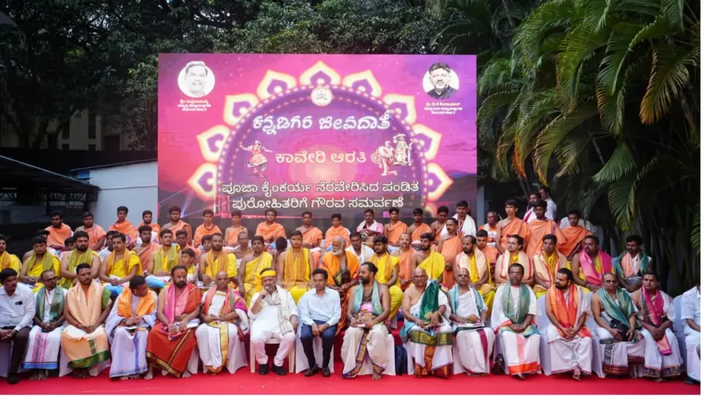 ಬೆಂಗಳೂರು: ಇದೇ ಮೊದಲ ಬಾರಿಗೆ ವಾರಣಾಸಿಯ ಗಂಗಾ ಆರತಿ ಮಾದರಿಯಲ್ಲಿ ದಕ್ಷಿಣ ಭಾರತದಲ್ಲಿ ಮೊದಲ ಬಾರಿಗೆ ಮಂಡ್ಯ ಜಿಲ್ಲೆ ಕೆ ಆರ್ ಎಸ್ ನಲ್ಲಿ ಐತಿಹಾಸಿಕ ಕಾವೇರಿ ಆರತಿಯನ್ನು (Cauvery Aarti) ಅಭೂತಪೂರ್ಣವಾಗಿ ನೆರವೇರಿಸಿದ ಪಂಡಿತ, ಪುರೋಹಿತರಿಗೆ ಡಿಸಿಎಂ ಡಿ.ಕೆ. ಶಿವಕುಮಾರ್ (D.K. Shivakumar) ಅವರು ಸನ್ಮಾನಿಸಿದರು.