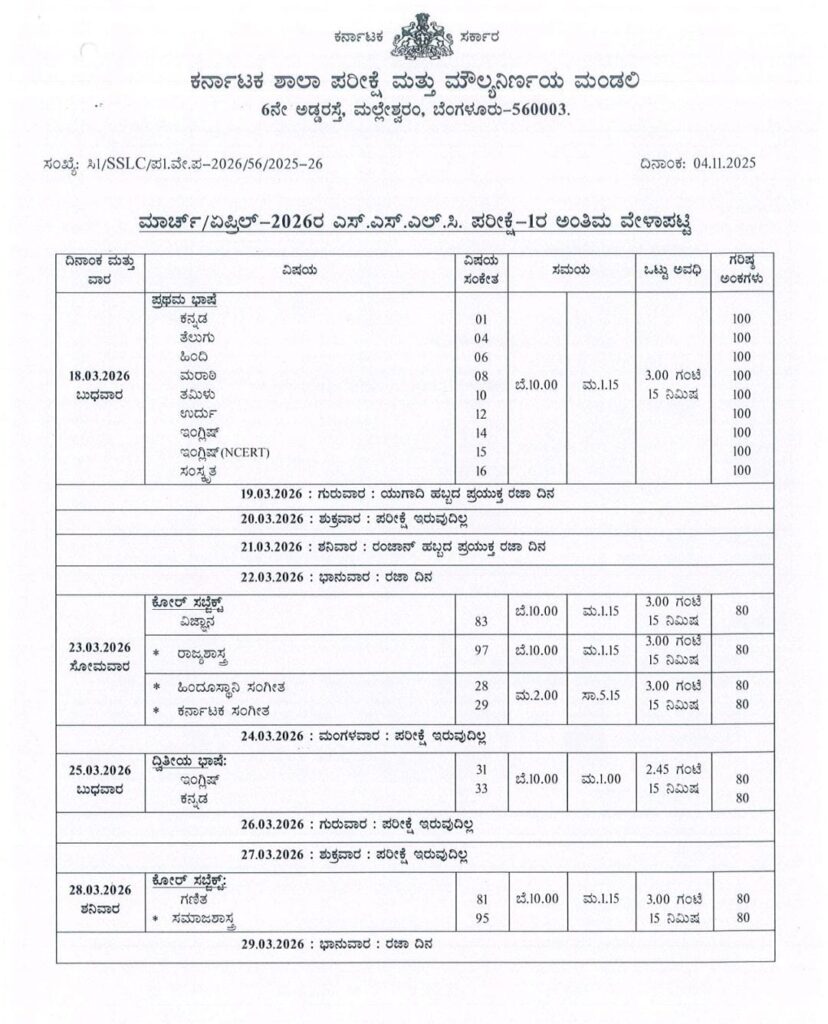 ಬೆಂಗಳೂರು: ಎಸ್ಎಸ್ಎಲ್ಸಿ (SSLC) ಮತ್ತು ದ್ವಿತೀಯ ಪಿಯುಸಿ (PUC) ಪರೀಕ್ಷೆ-1 ಮತ್ತು ಪರೀಕ್ಷೆ-2 ರ ಅಂತಿಮ ವೇಳಾಪಟ್ಟಿಯನ್ನು ಮಂಡಲಿಯ ಜಾಲತಾಣದಲ್ಲಿ ಪ್ರಕಟಿಸಿದೆ.