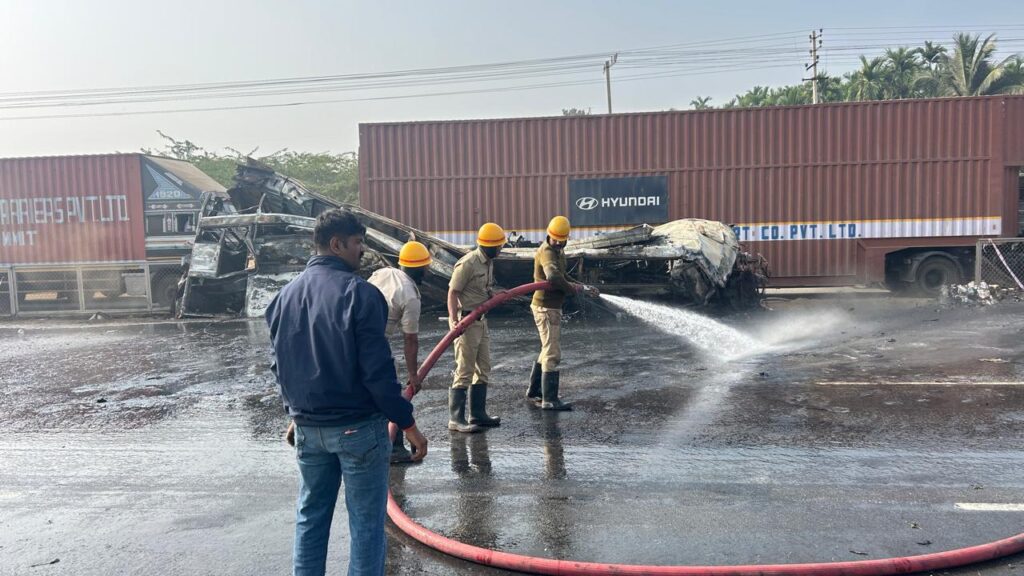 ಬಸ್ ಅತಿವೇಗದಿಂದ ಕಂಟೈನರ್ ಲಾರಿ ಗೆ ಡಿಕ್ಕಿ ಹೊಡೆದಿದ್ದು, ಡಿಕ್ಕಿ ಹೊಡದ ರಭಸಕ್ಕೆ ನೋಡ ನೋಡುತ್ತಿದ್ದಂತೆ ಬೆಂಕಿ ಹತ್ತಿಕೊಂಡಿದೆ. ಬೆಂಕಿಯ ಕೆನ್ನಾಲಿಗೆಗೆ ಪ್ರಯಾಣಿಕರು ಸುಟ್ಟು ಕರಕಲಾಗಿದ್ದಾರೆ. ಸಾವಿನ ಸಂಖ್ಯೆ ಮತ್ತಷ್ಟು ಹೆಚ್ಚಾಗುವ ಸಾಧ್ಯತೆ ಇದೆ ಎನ್ನಲಾಗಿದೆ.